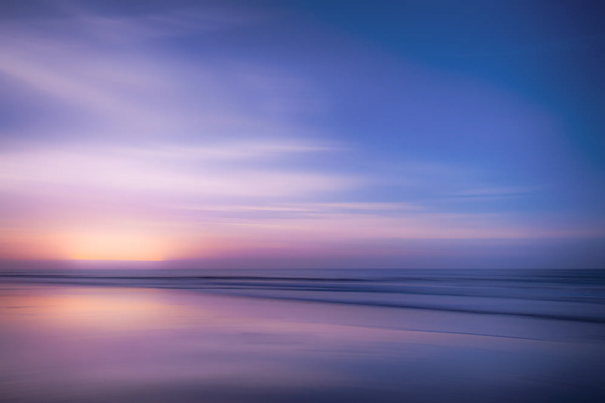 It was a deserted beach as the sun came up over the horizon and filled the sky with purple and pink brushes that were then reflected in the wet sand at tide’s edge. I used intentional camera movement to complement the colors by smoothing out the water and clouds, with the slight blur evoking the feel of the morning.