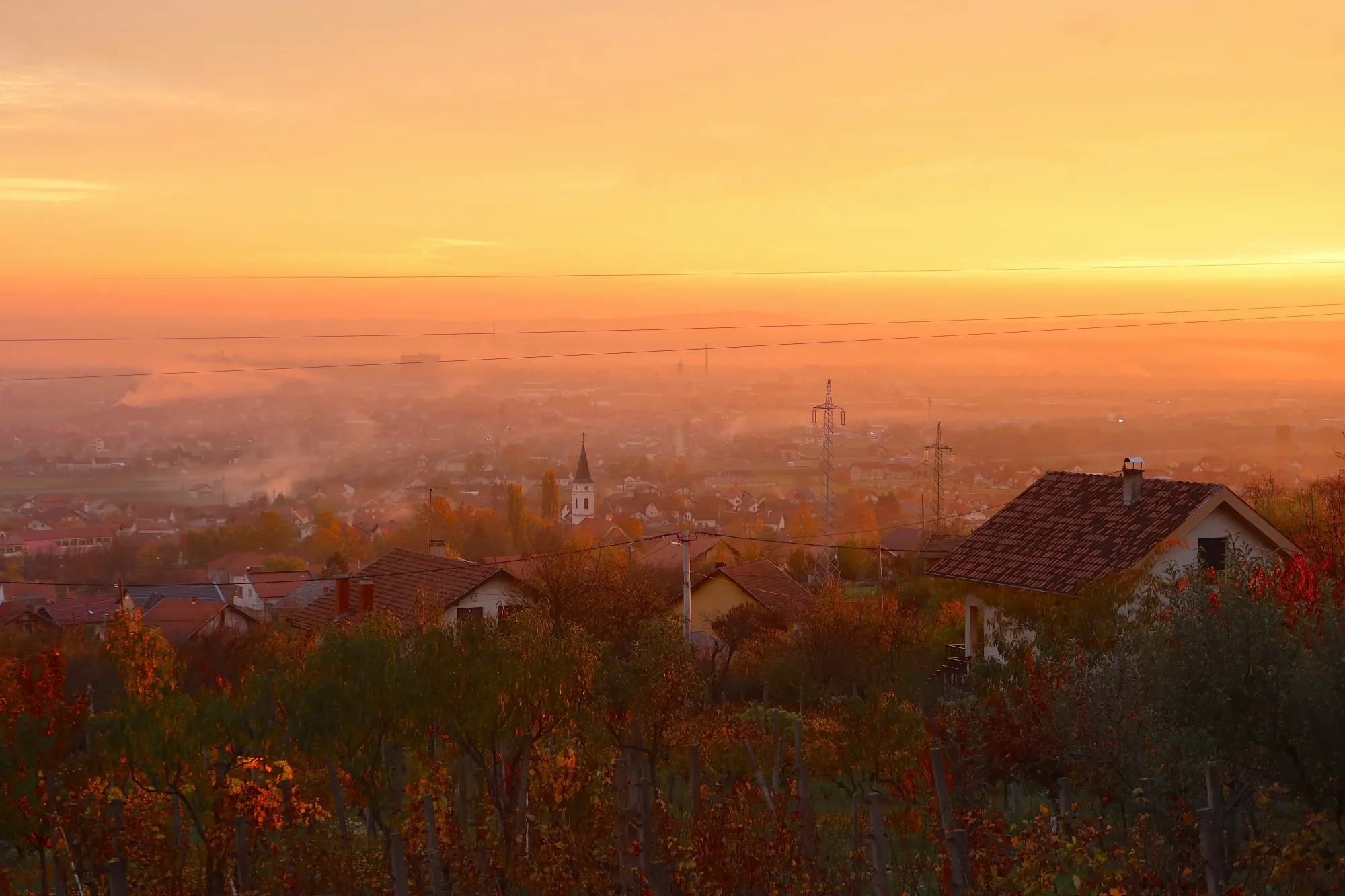 Captured in northeastern Croatia, overlooking a Slavonian vineyard at dusk. Smoke drifts from home-heating woodstoves and open fires used to prepare seasonal foods such as “kulen” sausage, “rakija” brandy, and “ajvar” relish, as the town readies itself for both night and winter.