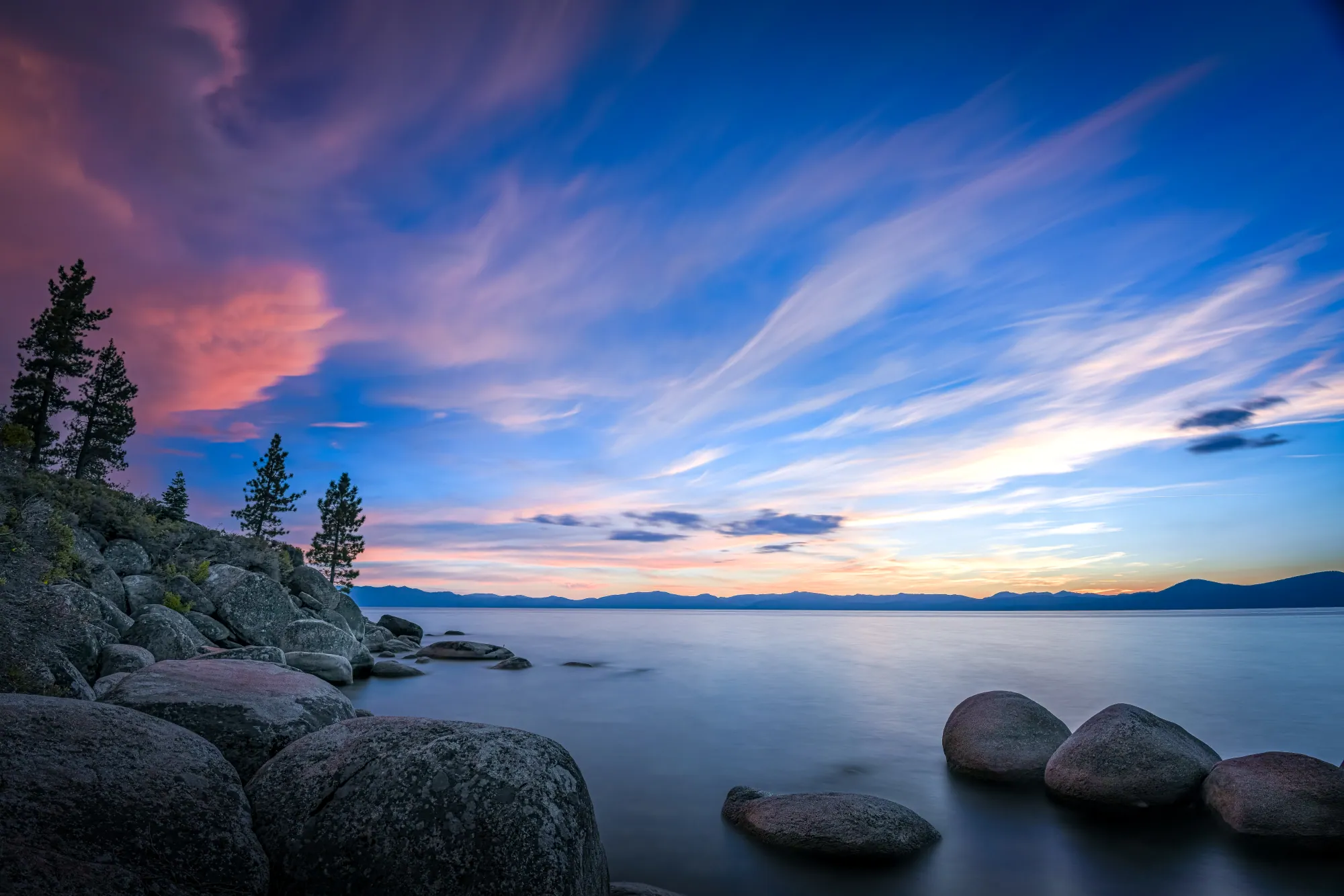 As the sun set behind the rocky coastal extension, the streaking clouds lit up for a few moments. By extending the exposure, I was able to allow the movement of the clouds to create not just lines but directional arrows, beckoning to the unseen behind the Douglas Firs at the edge of this Tahoe coast.