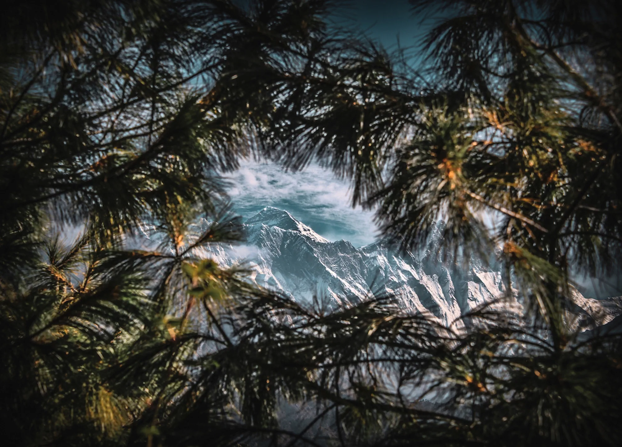 A moody Sagarmatha (Mt. Everest), Mother Goddess of the World, is glimpsed through a veil of pine needles as the monsoon clouds lift. Namche Bazar, Khumbu Region, Nepal.