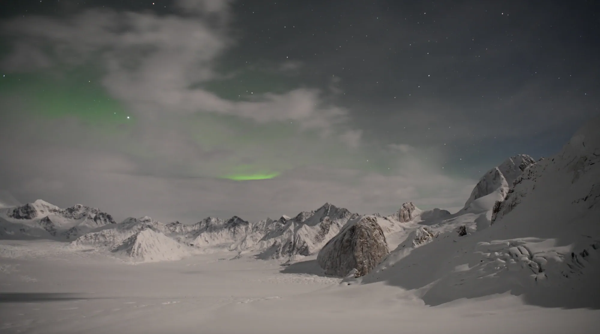 This photo shows Ruth Glacier in Denali, Alaska. Above the glacier, the aurora borealis lights up the night sky with beautiful green colours. We see a snow-covered bowl, gleaming with fresh snow that reflects the aurora’s ethereal, arching light. This image relates to Alaska’s ecosystem as the aurora signals solar activity influencing climate, while the glacier’s resilience is a testament of nature’s adaptability despite change.