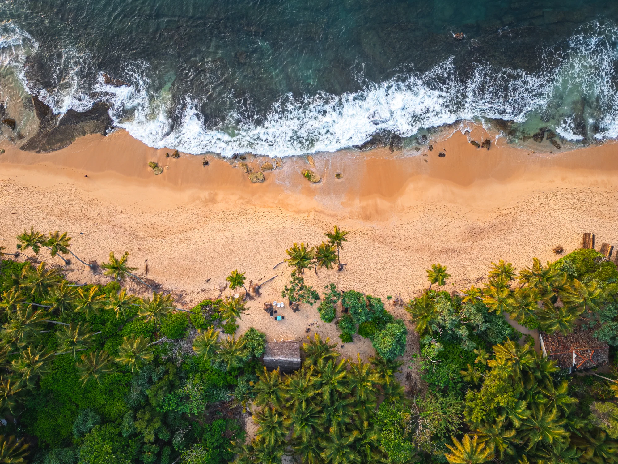 An aerial perspective of a tropical coastline — where turquoise waves meet golden sands and palm trees. This photograph captures the essence of wandering freely across an island, discovering places where nature remains untouched and serene.