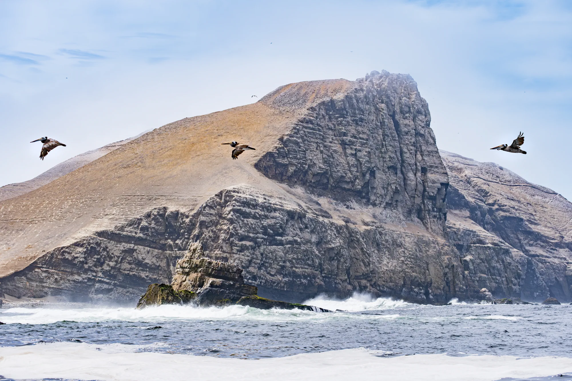 Outside of Lima, Peru, a flock of birds sweep above the rugged coastal cliffs where ocean, desert, and stone meet.